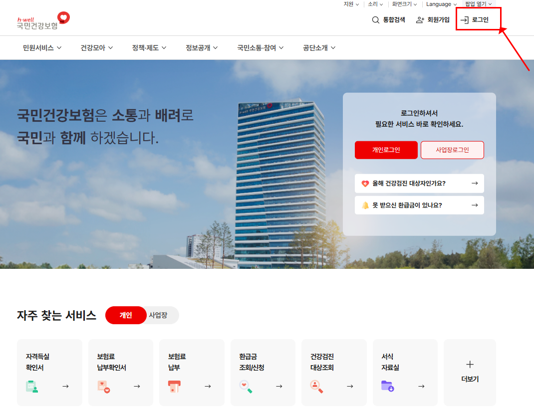 먼저 국민건강보험공단 홈페이지에 접속합니다. 메인 화면 우측 상단에 있는 '로그인' 버튼을 클릭해 로그인합니다. 공동인증서(구 공인인증서)나 간편인증을 사용할 수 있습니다.